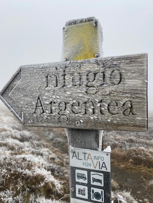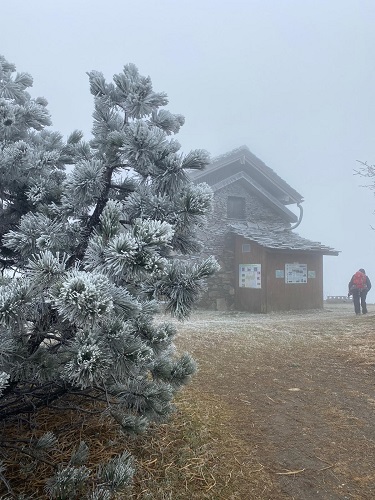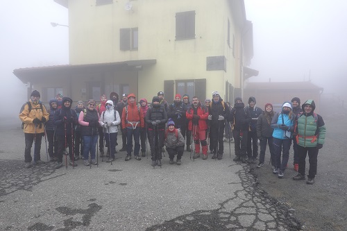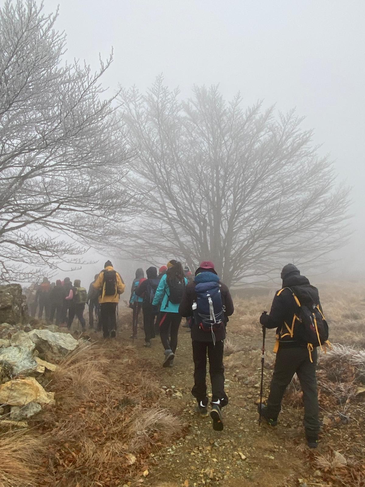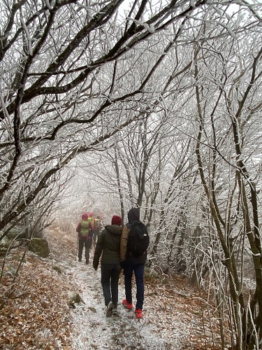 Nonostante il meteo non sia stato molto clemente, con una giornata di nebbia e vento, la natura ha regalato uno spettacolo unico: gli alberi e le rocce erano adornati da meravigliose concrezioni di ghiaccio, creando un’atmosfera incantata che ha reso l’escursione ancora più suggestiva. I partecipanti, avvolti da un leggero strato di brina, si sono ritrovati a diventare parte di un quadro naturale straordinario.