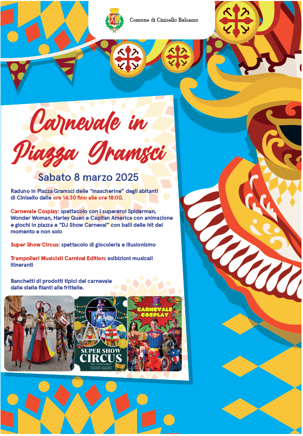 Sabato 8 marzo, dalle 14.30, ritrovo in Piazza Gramsci per un pomeriggio ricco di divertimento e intrattenimento con spettacoli circensi, trampolieri itineranti e musica in compagnia dei supereroi più amati dai bambini.
