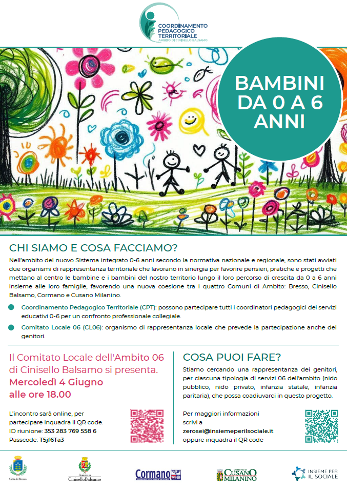 Ora c’è la necessità di individuare delle rappresentanze dei genitori nel Comitato Locale 06 e per questo si propone un momento on line per le famiglie 06 per raccontare cosa fa il Coordinamento pedagogico di ambito e il Comitato locale 06 e quale contribuito può dare il genitore in questo processo di governance che mette al centro le bambine e i bambini da 0 a 6 anni dei 4 comuni di Ambito.