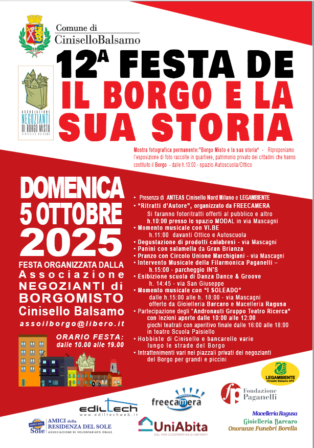 L’Associazione negozianti di Borgo misto in collaborazione con l’Amministrazione Comunale di Cinisello Balsamo organizza la “12° Festa del Borgo” che si terrà domenica 5 ottobre 2025 nel quartiere di Borgo misto.