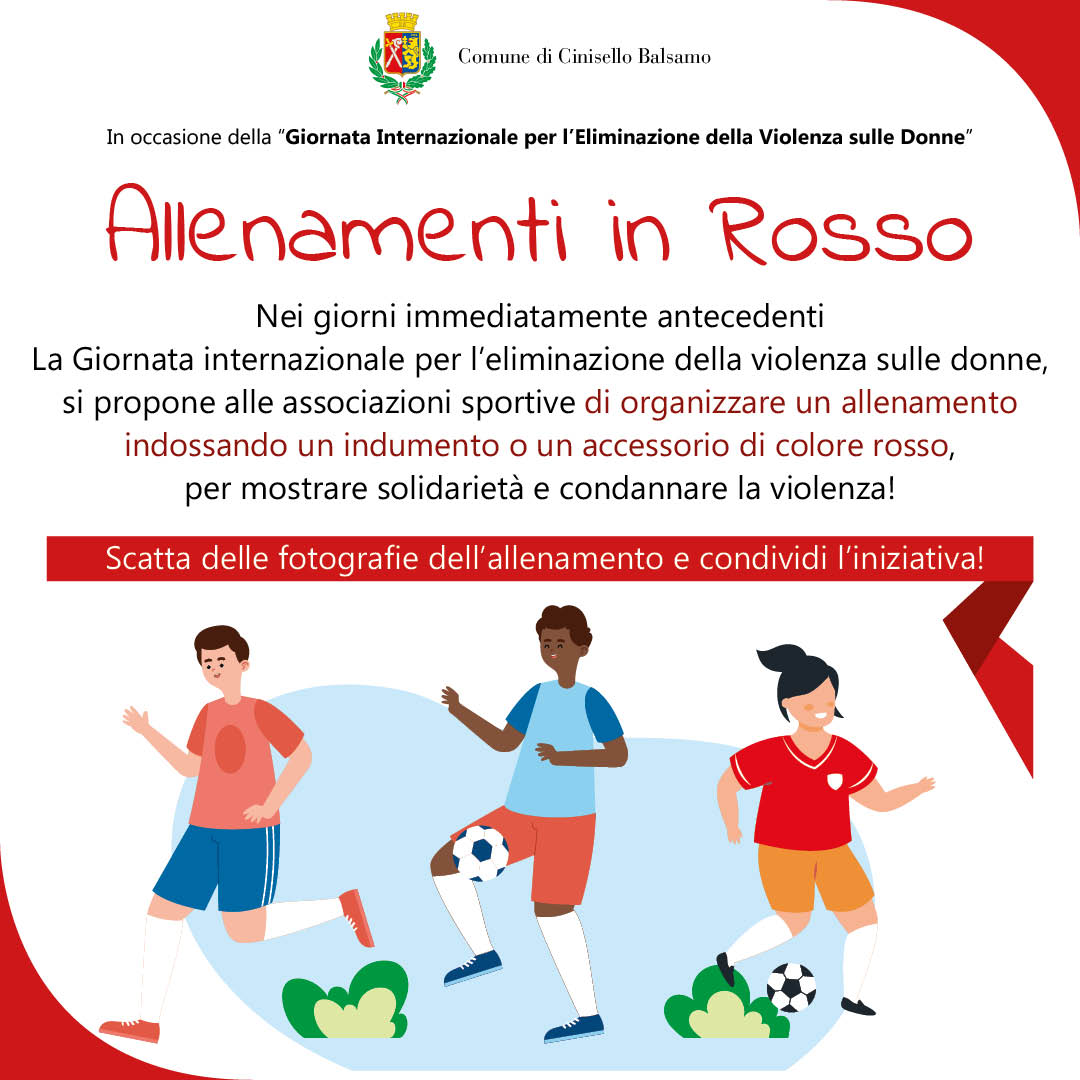 In occasione della Giornata Internazionale contro la violenza sulle donne, proponiamo alle associazioni e società sportive del territorio di aderire all’iniziativa "ALLENAMENTI IN ROSSO": un ulteriore modo per sensibilizzare al tema.