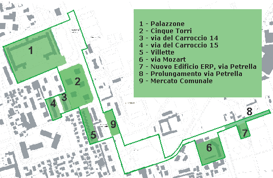 Nel suo insieme l’ambito oggetto degli interventi si caratterizza da una parte per una buona dotazione di spazi verdi, come molte delle periferie costruite in quegli anni, ma dall’altra lamenta la mancanza di spazi commerciali e di servizi pubblici, condizione che obbliga gli abitanti a spostarsi per qualsiasi genere di necessità.