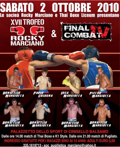 Sabato 2 ottobre 2010 al Palazzetto dello Sport di Cinisello balsamo, via XXV Aprile, dalle 14,30 match di Thai Boxe e K1 Stile e dalle 21,00 match di Pugilato.